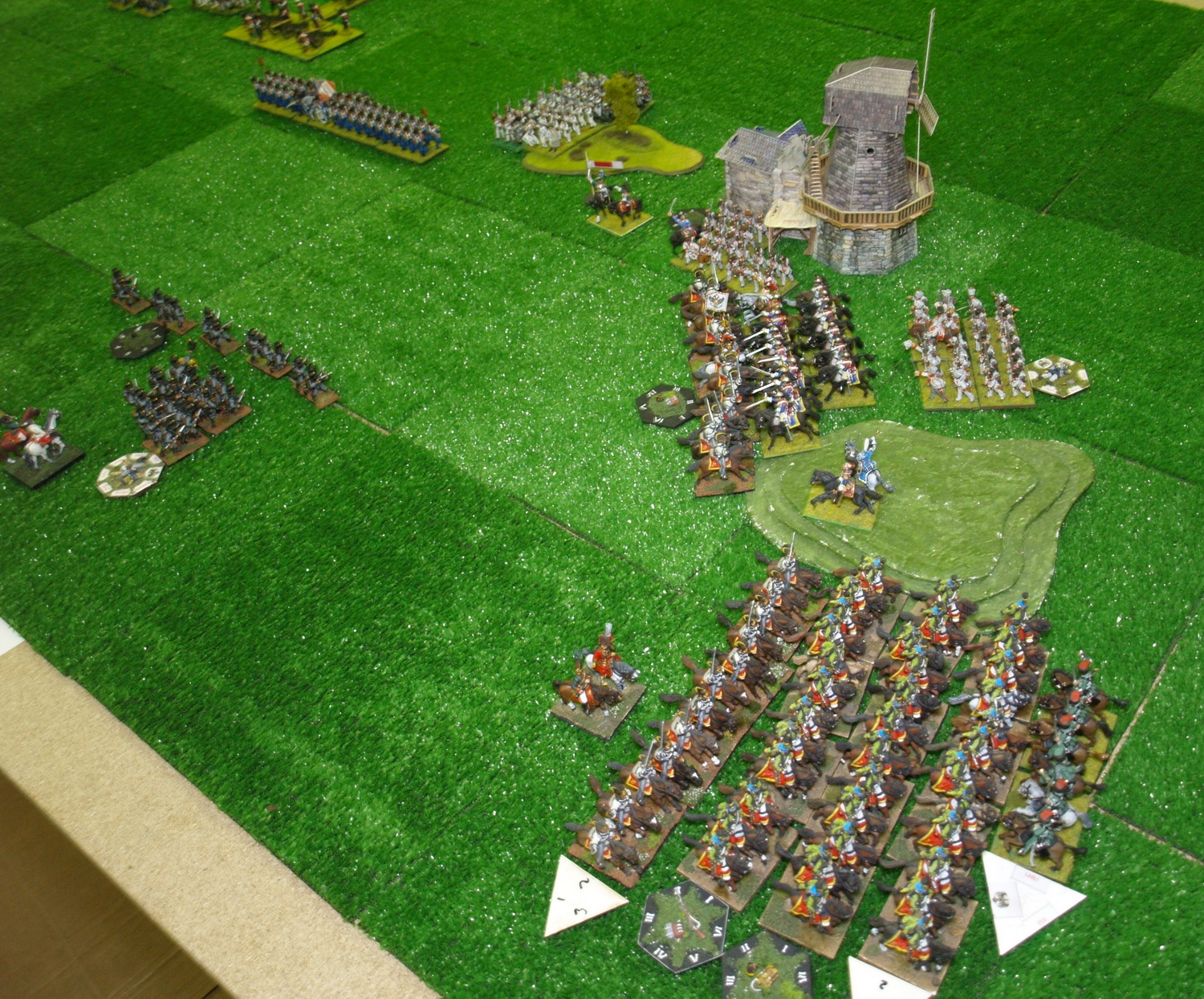 Инициативу выиграли Австро-Прусские войска. Гусарский полк №4 объявляет атаку на шевалежер-лансье. Все проходят мораль и сближаются, подкрепление гусарам в 2 дивизиона и шевалежер-ланьсе в виде егерей Нассау поступает без промедления.