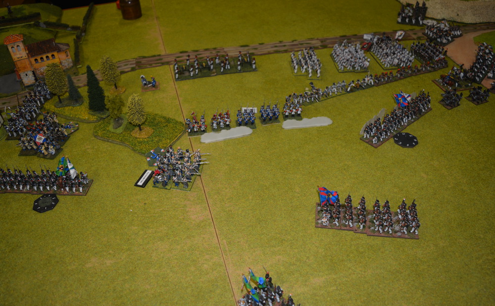 Французы продолжают атаки, русские упорно сопротивляются. Однако 1-й батальон 7-го легкого полка прорывается к колонне 3-го батальона Рыльского полка и одерживает победу в рукопашке. Далее у них всё складывается просто замечательно и без заноз. Батальон французов остаётся построенным и бонусом поворачивается на 45 градусов, угрожая атакой во фланг русской артиллерии.