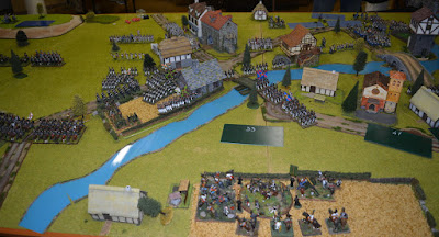 В основном в городе дрались одни и те-же батальоны :-). На каменном мосту батальон 27-го полка легкой пехоты весь бой пытался пролезть через батальон Полоцкого полка, под занавес сражения, из-за потерь был рассеян и его сменил батальон Невшатель. На перекрёстке, за понтонной переправой, 3-й батальон Екатеринбургского полка неудачно попался на фланговую атаку, однако устоял и выдержал в последствии ещё три атаки, заставляя противника отступать или останавливаться, однако понёс критические потери и отступил. 1-й батальон Екатеринбургского полка держался на переправе тоже достаточно долго, но как только начал атаку сам - отступил. В узких улочках, между домами геройствовал 3-й батальон Полтавского полка, выдерживая одновременные атаки от двух бригад, но опять же - как только сам начал атаку, пришлось отступить. Предприняв обход через сады два русских батальона по очереди атаковали во фланг саксонцев, но в первом случае остановились, сломав строй, во втором случае проиграли рукопашный бой. Так же была предпринята атака через деревянный мост французским батальоном 7-го лёгкого полка на правый русский фланг, но она провалилась. Под занавес сражения Сасконцам удалось выбить 1-й батальон Ладожского полка из серого каменного здания. На том и завершилось.