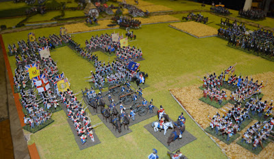 У французов в центре была вся кавалерия и гвардейская пехотная бригада. У британцев так же кавалерия занимала место в центре и вдобавок было четыре пехотных бригады. Обе стороны предприняли атаки кавалерией на пехотные порядки. И если у британцев атака тяжелой кавалерии была сорвана залпами гвардейских частей Императора, то вот французам удалось нанести удачный удар. Гвардейский уланский полк в рукопашной схватке рассеял британский батальон. В следующем ходу в атаке гвардейские конные егеря рассеяли артиллерию, потом врубились в ряды британской пехоты, батальон которой рассеяли в ходе рукопашного боя. Бригада "красных раков" была разбита, начала отступать и ещё два батальона ушли с поля боя. В этот же момент в атаке сошлись французские карабинеры против легких драгун островитян, первый раунд схватки закончился вничью и в следующем ходу обе стороны усилили бой, результатом которого стало поражение британской кавалерии, которая отступила за поле боя. И еще - в это же время 5-й гвардейский драгунский полк вновь предпринял атаку на порядки французской гвардии и во время атаки, получив колоссальный урон, был рассеян. За два хода британцы потеряли 4 батальона пехоты, 3 кавалерийских полка, двух убитых генералов и две артиллерийские роты. В дальнейшем французская сторона попыталась атаковать кавалерией, но неудачно. Получив подкрепление ещё одной бригадой кавалерии из резерва, французы начали готовить мощный штурм в центре на ощетинившуюся штыками пехоту подданных британской короны, но наступавшие сумерки закончили ратное дело.